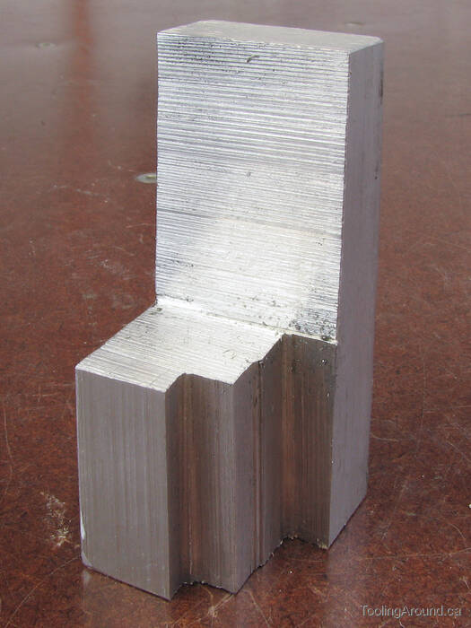 The body started as a piece of mystery metal. It was clearly aluminum, but of unknown composition and was actually a bit “gummy” to machine, resulting in a generally rough finish. You can see how the long edge next to the vise jaw sort of curled over.