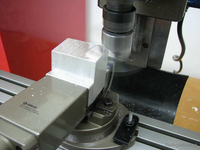 In this photo, the bottom of the jig is against the fixed jaw of the vise. When in use, the bottom of the jig will be sitting on the mill table and the slot floor will be 7° from horizontal. This means that the lathe tool's side rake will be 7°.