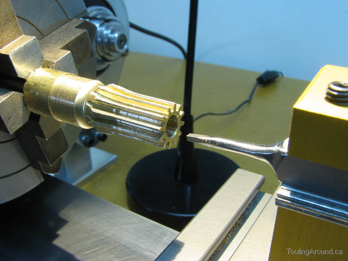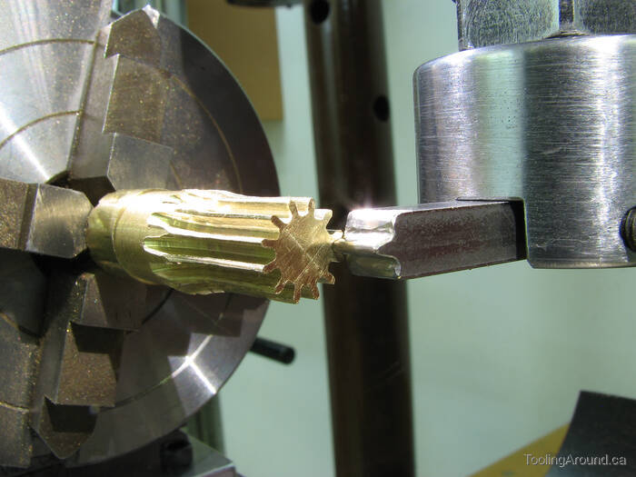 As mentioned above, I did not choose an ideal method for cutting the gear. To avoid heat treating, I chose to simply grind a lathe tool to shape. It happened that I had no suitable material on hand for the preferred cutter.